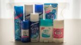 洗面スペースに並べた複数ブランドのデオドラント製品と観葉植物